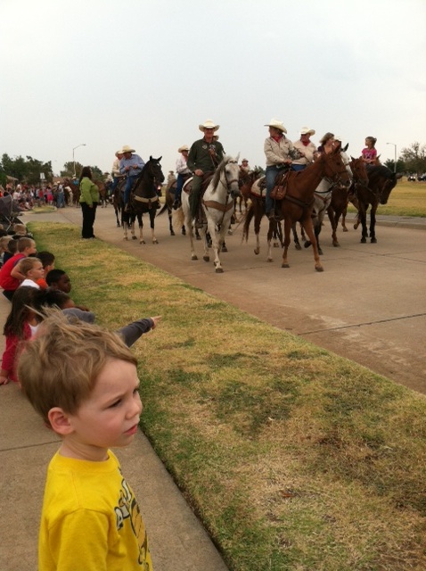 Our town's rodeo was this past weekend and the kick off is a parade of all the cowboys who participate. They close down the streets and parade through town. Con-Man loved it.